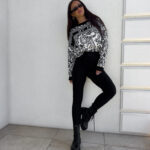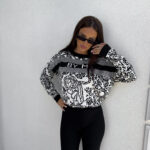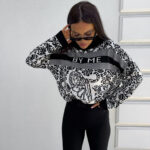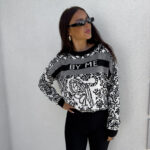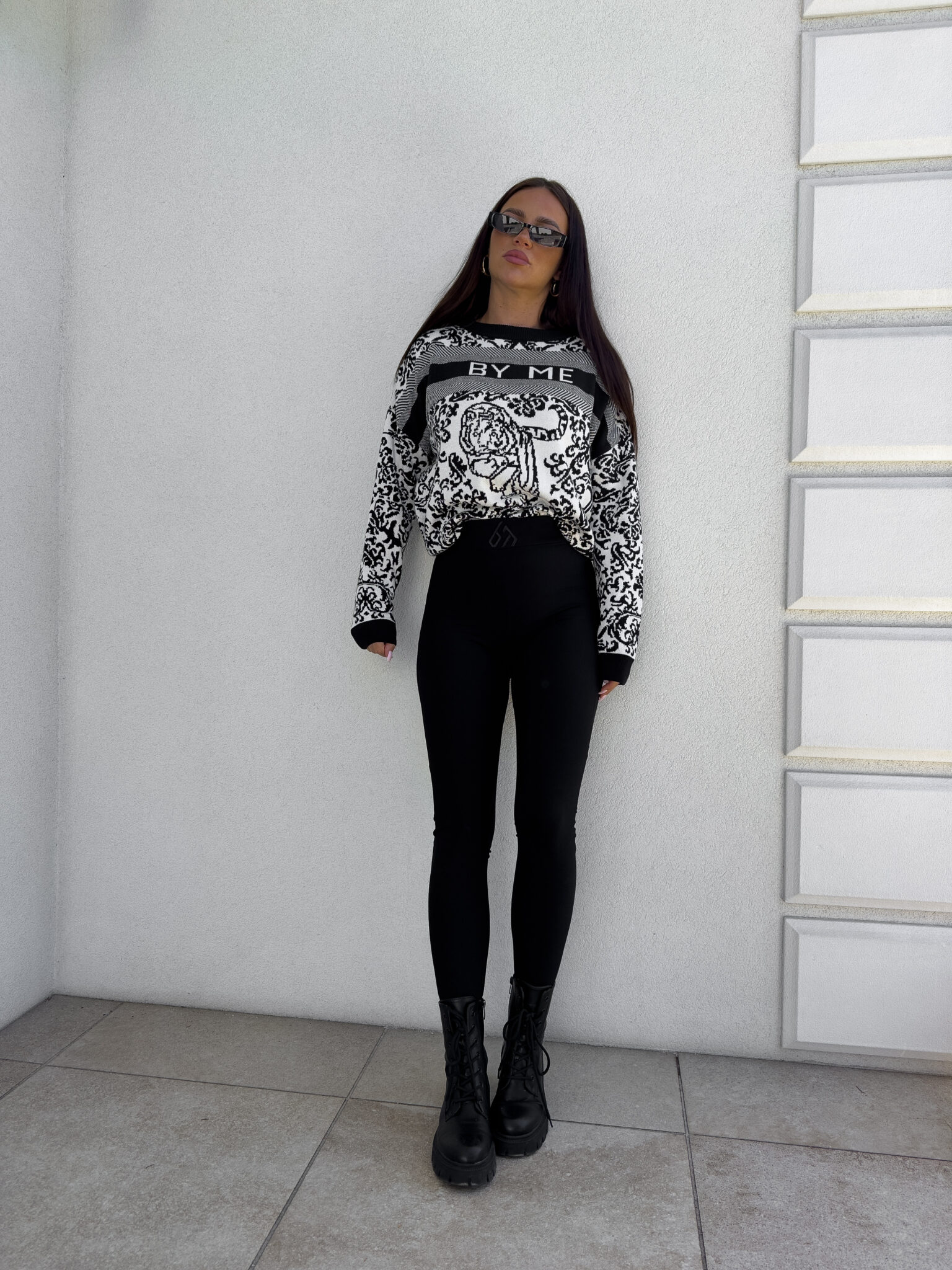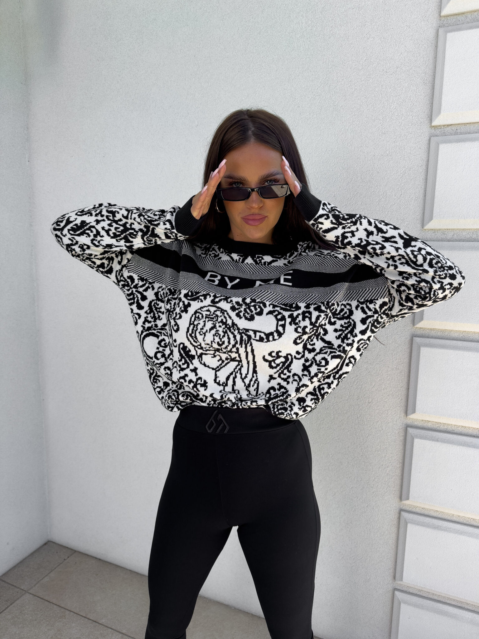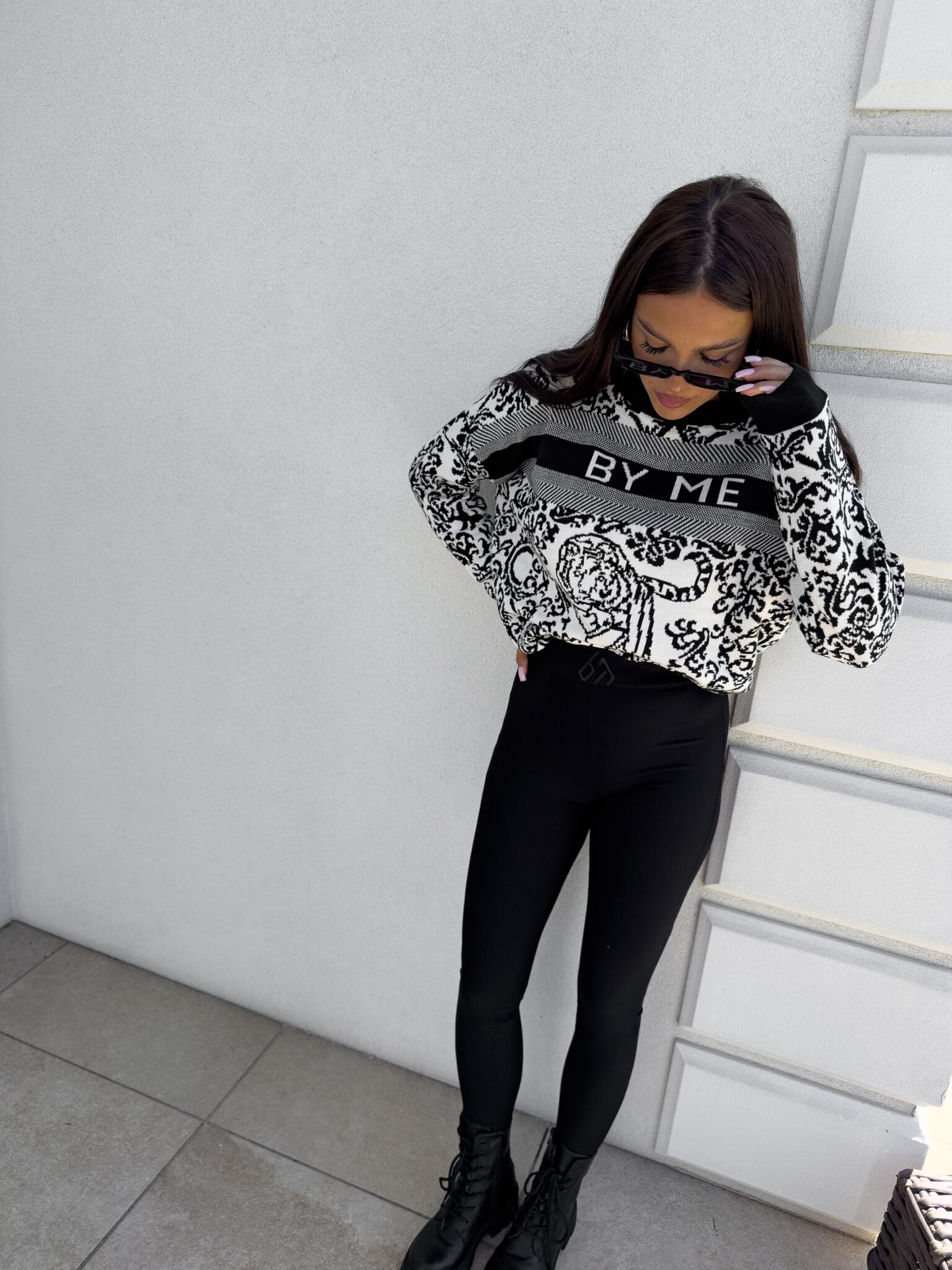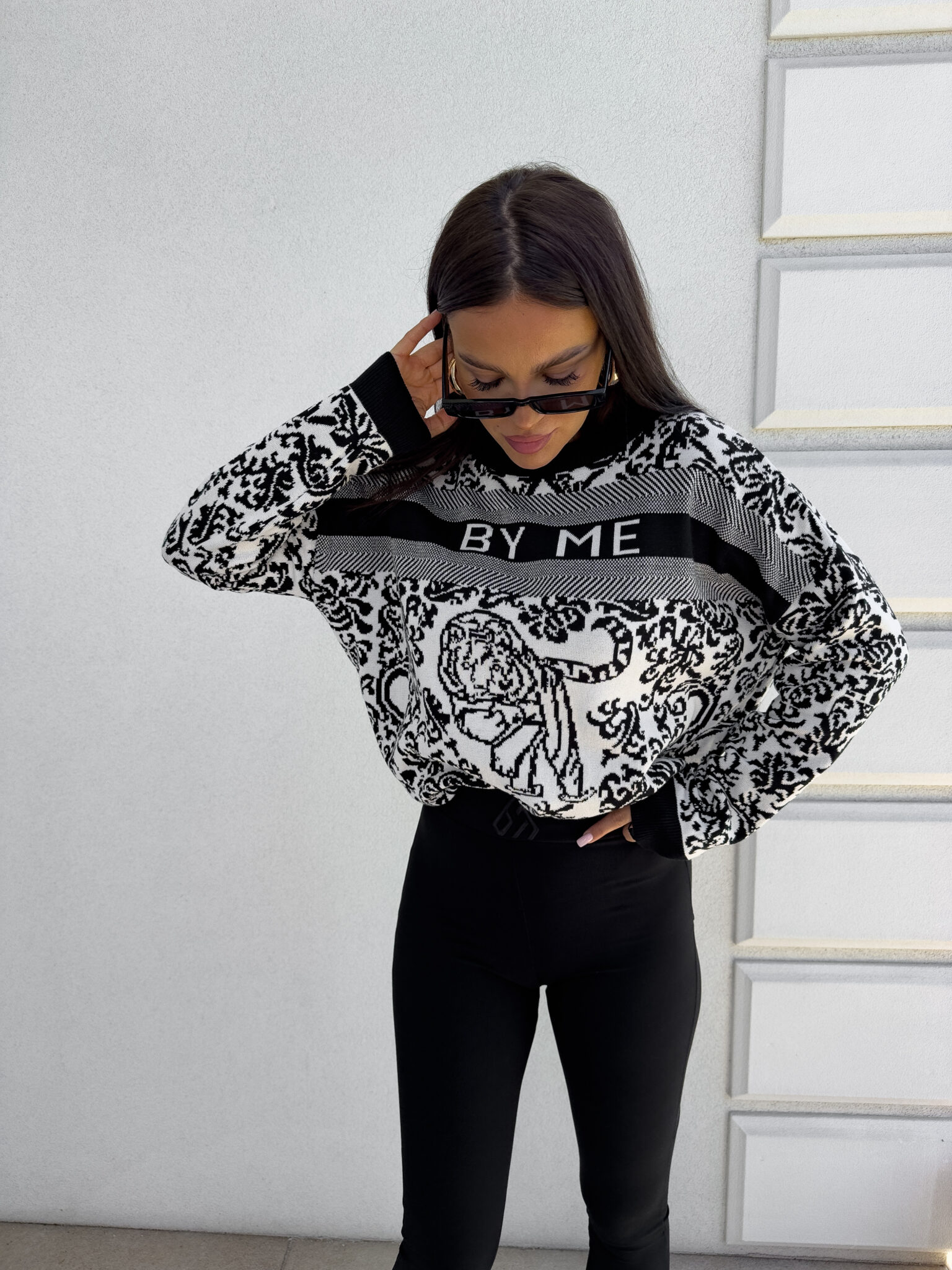 Sweter DIO o luźnym, oversize’owym kroju wykonany jest z miękkiego materiału i zakładany przez głowę. Ma długie rękawy ze ściągaczami przy mankietach i u dołu. Zdobiony jest wyrazistym motywem graficznym inspirowanym ornamentami oraz napisem „BY ME” na wysokości klatki piersiowej.