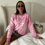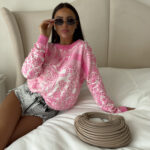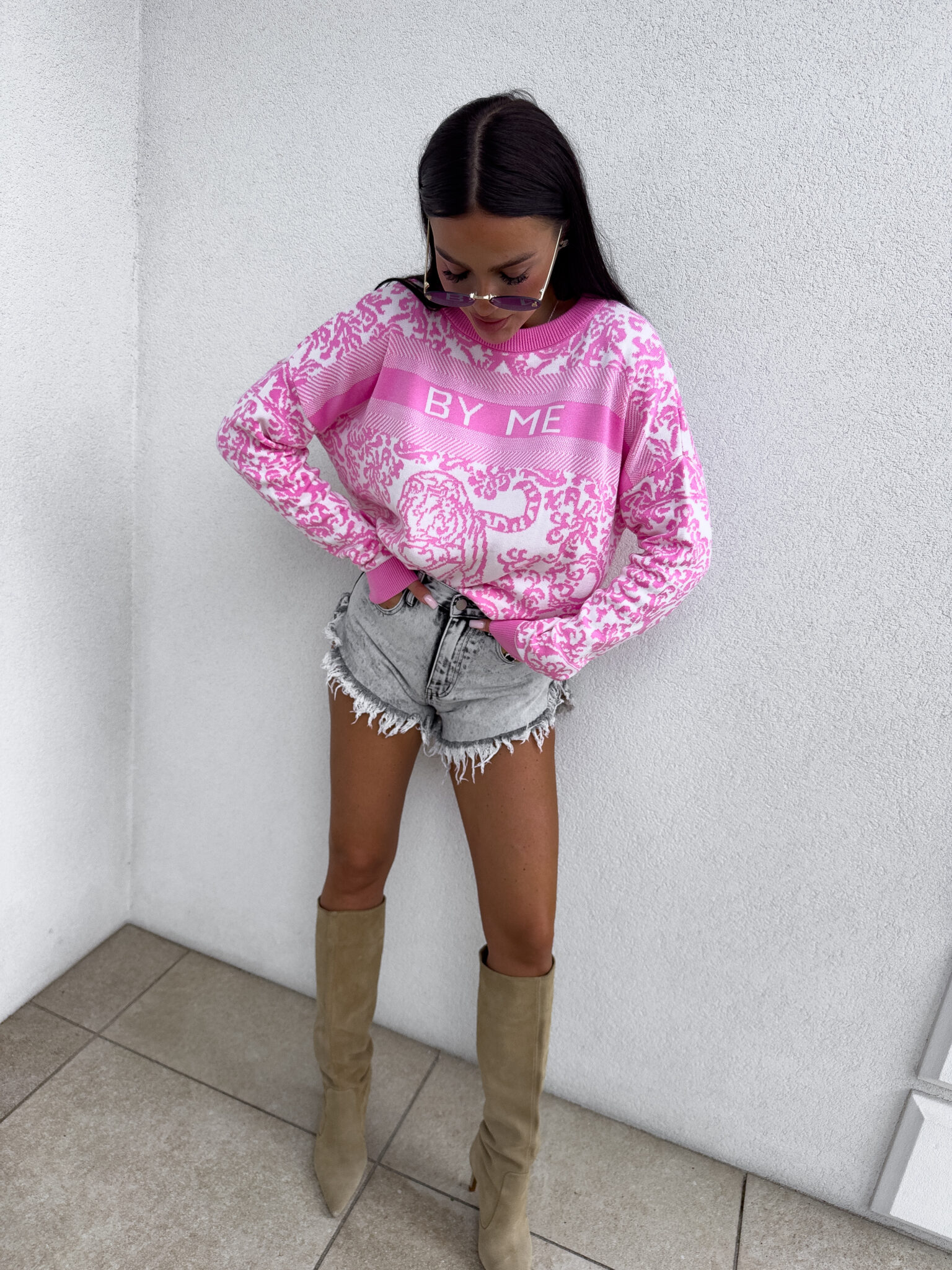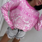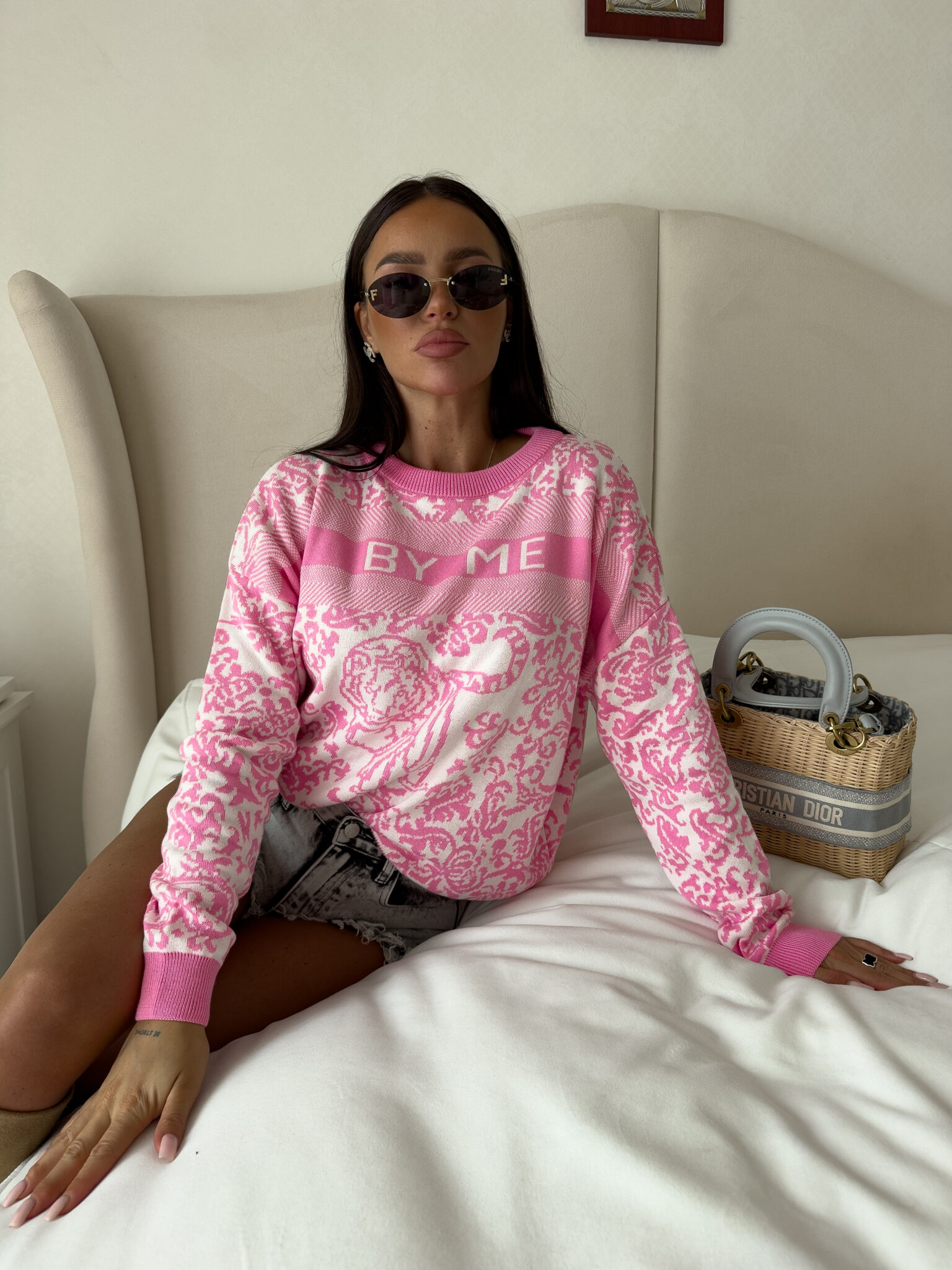 Sweter DIO o luźnym, oversize’owym kroju wykonany jest z miękkiego materiału i zakładany przez głowę. Ma długie rękawy ze ściągaczami przy mankietach i u dołu. Zdobiony jest wyrazistym motywem graficznym inspirowanym ornamentami oraz napisem „BY ME” na wysokości klatki piersiowej.