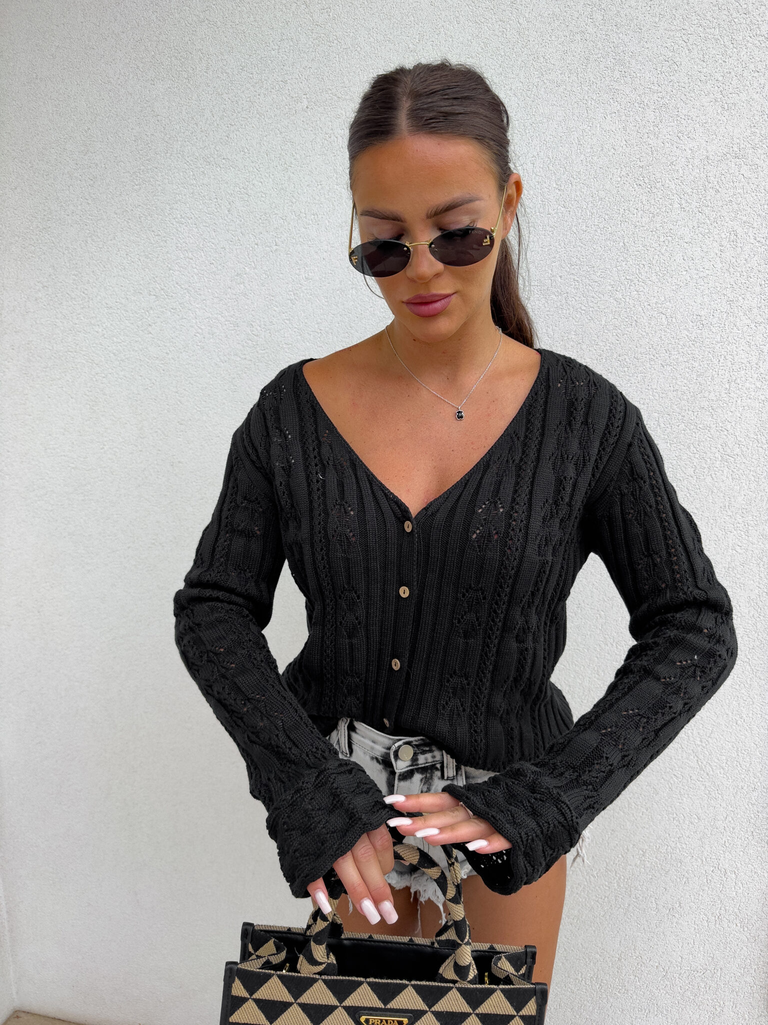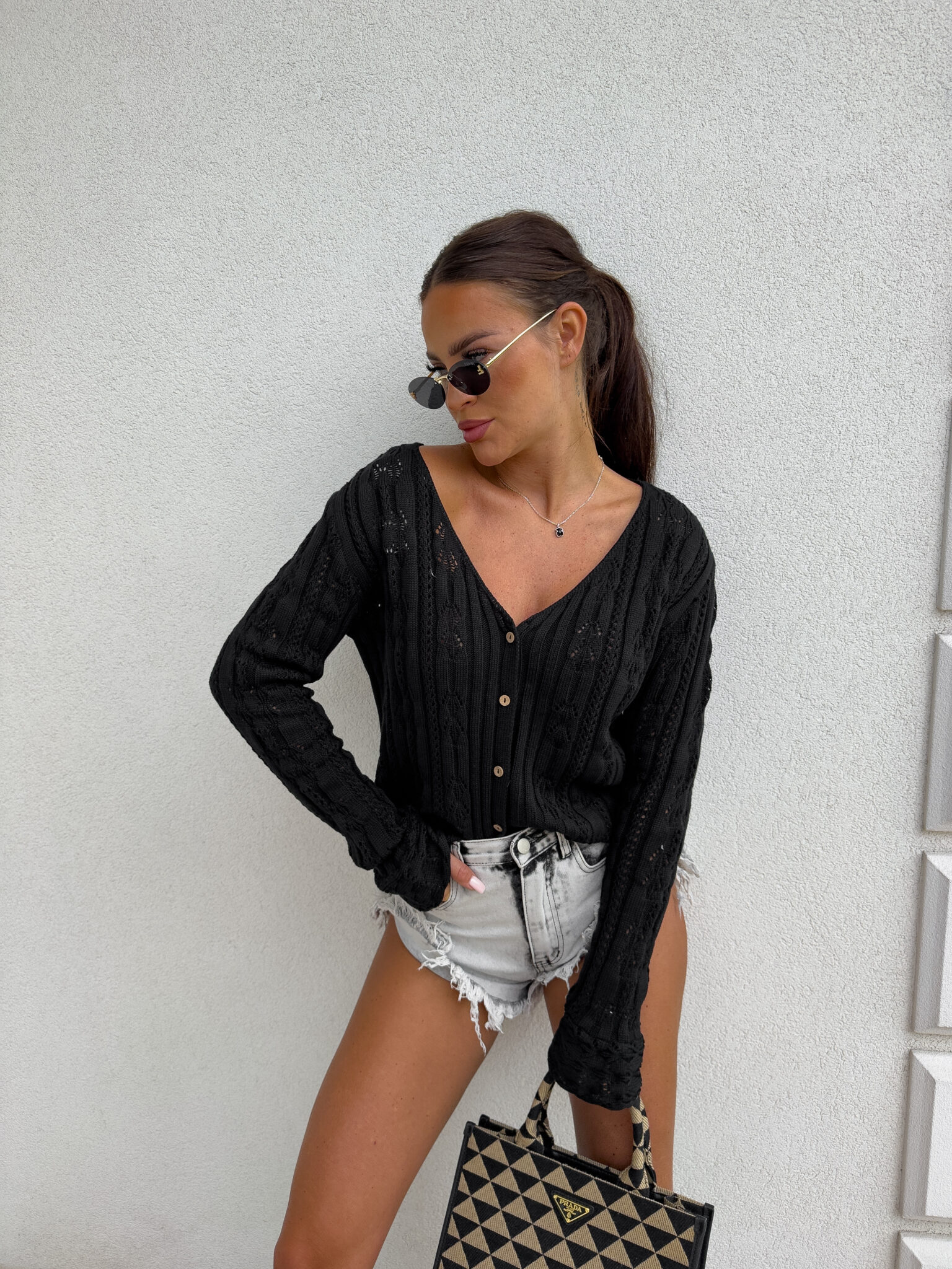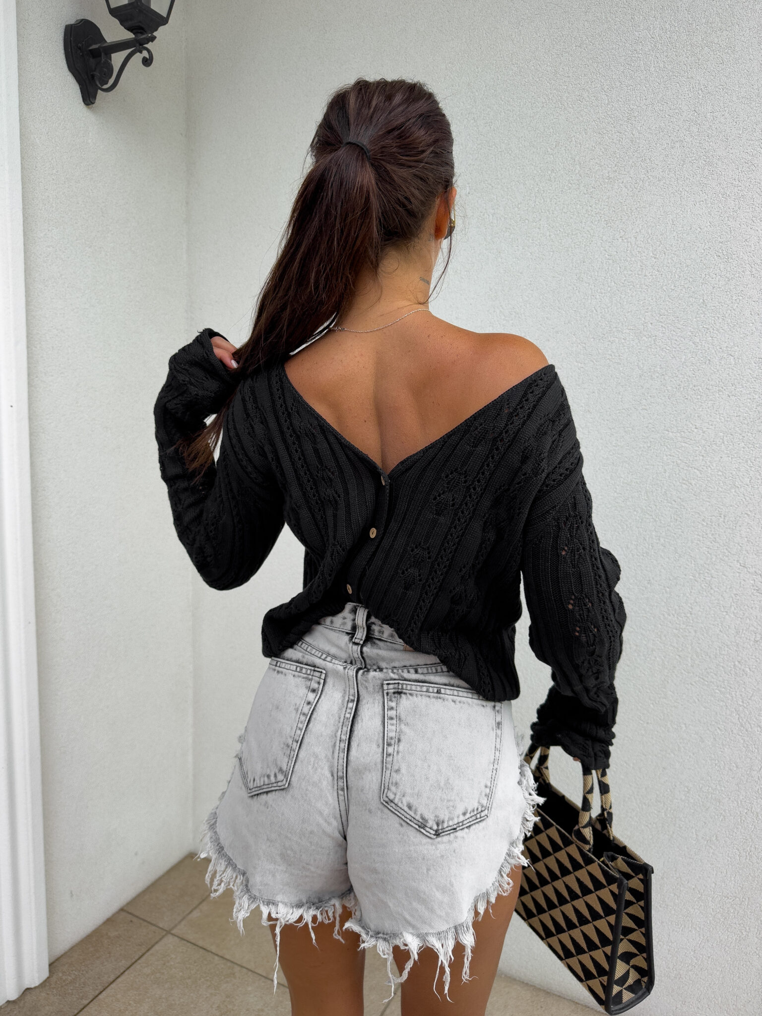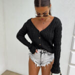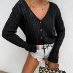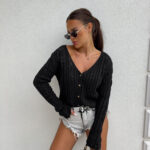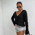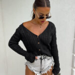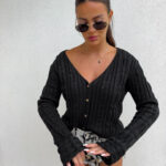 Ażurowy sweter RICOTTA z długim rękawem i dekoltem w serek to połączenie stylu i wygody. Wykonany z miękkiej dzianiny o strukturalnym splocie z delikatnymi ażurami, zapinany jest na małe, drewniane guziki. Luźny krój i przyjemny materiał gwarantują komfort noszenia, a głęboki dekolt dodaje subtelnej zmysłowości.
