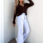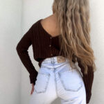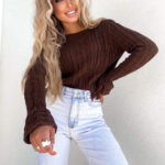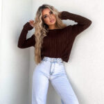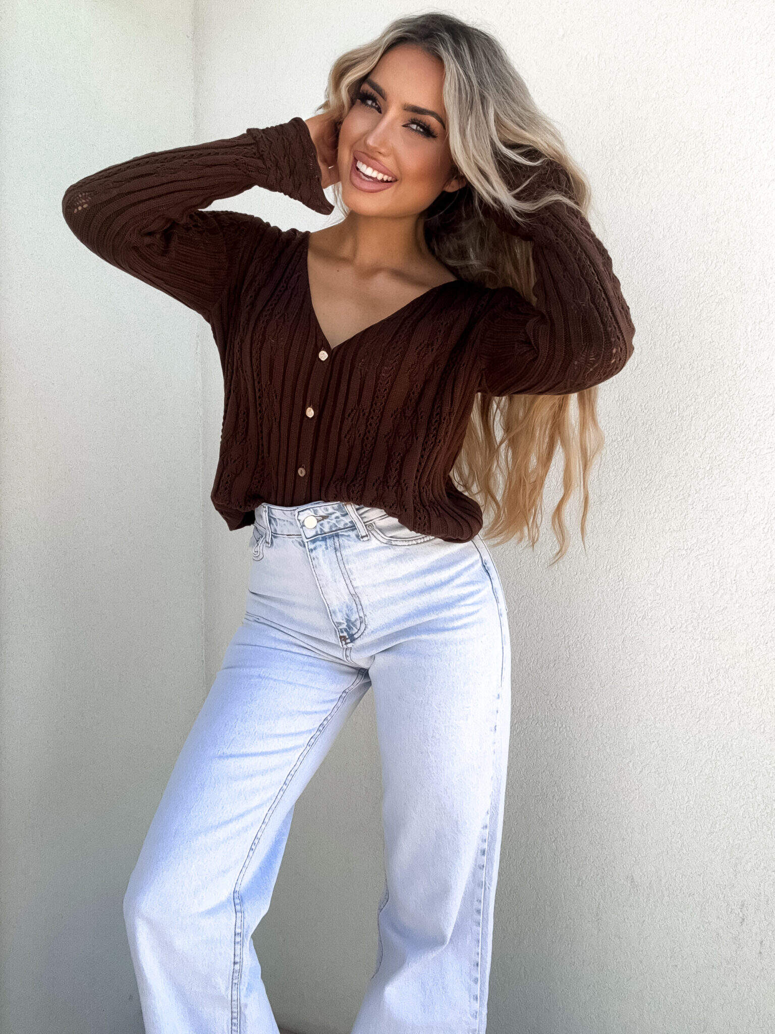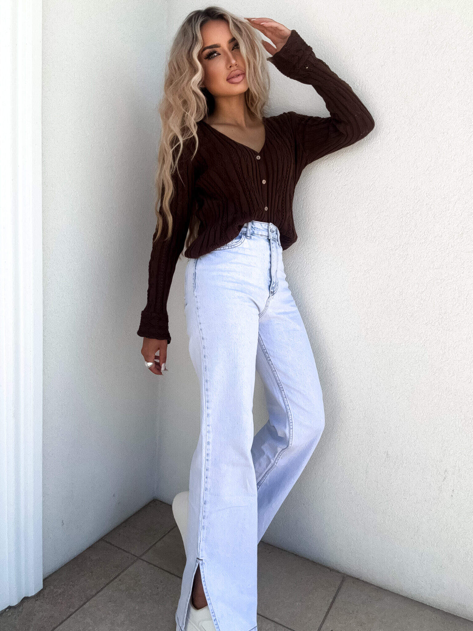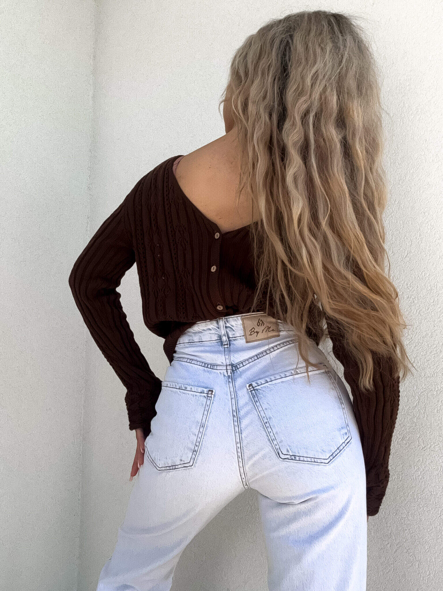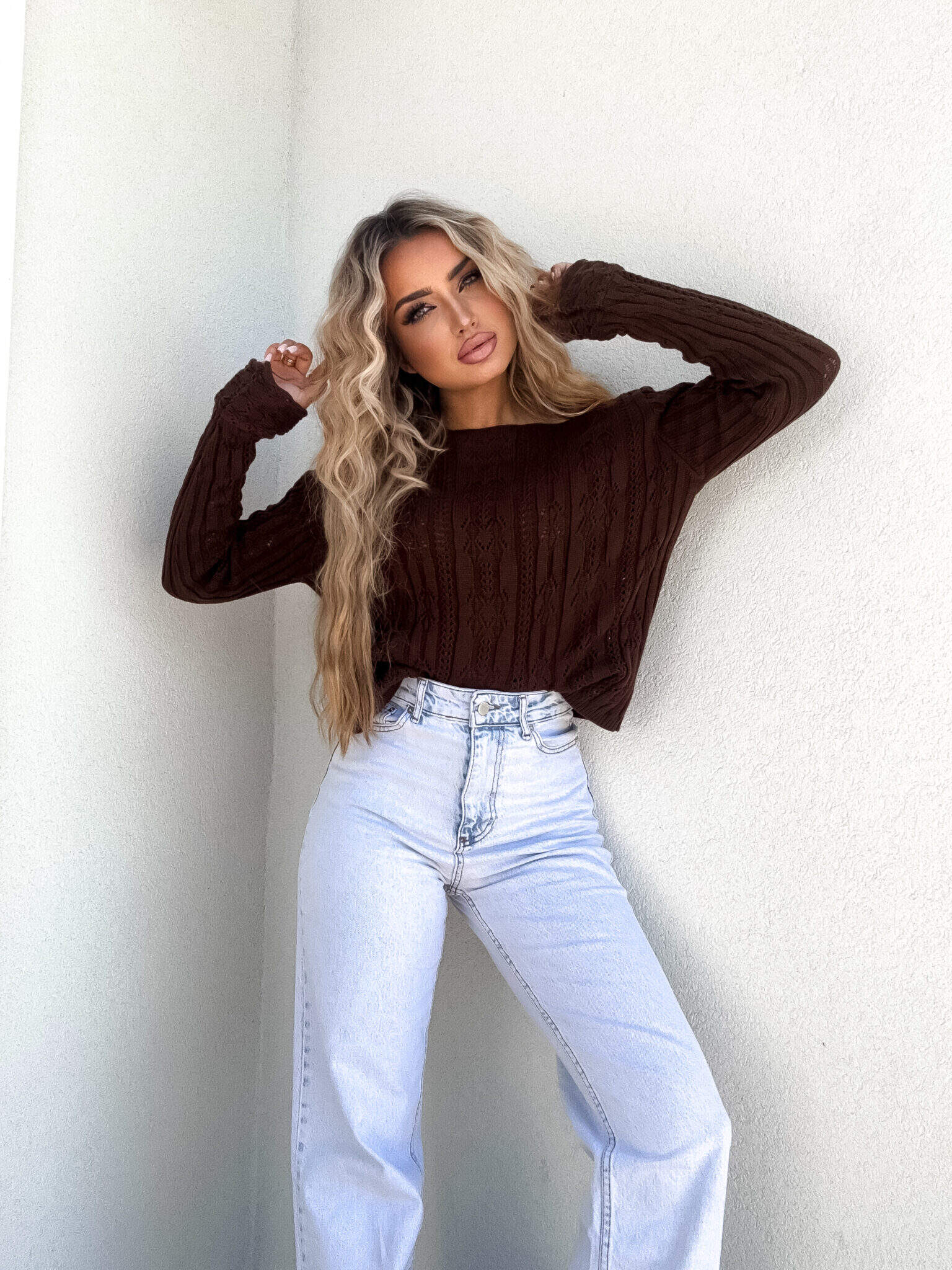 Ażurowy sweter RICOTTA z długim rękawem i dekoltem w serek to połączenie stylu i wygody. Wykonany z miękkiej dzianiny o strukturalnym splocie z delikatnymi ażurami, zapinany jest na małe, drewniane guziki. Luźny krój i przyjemny materiał gwarantują komfort noszenia, a głęboki dekolt dodaje subtelnej zmysłowości.