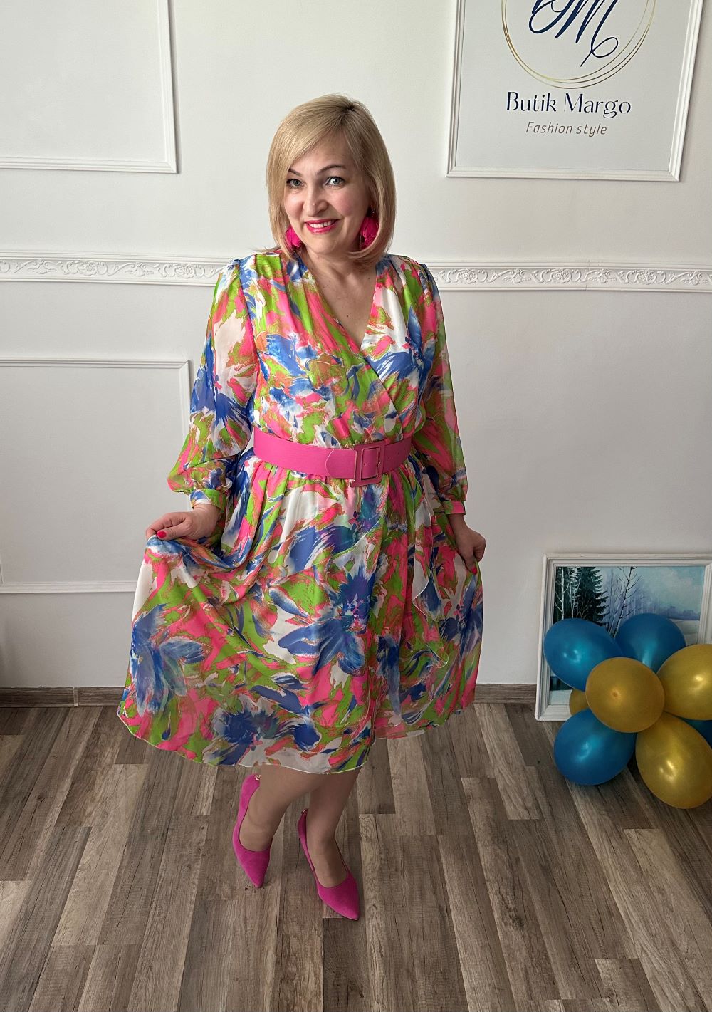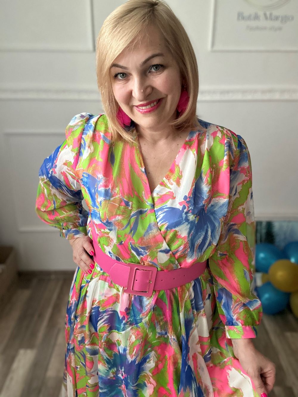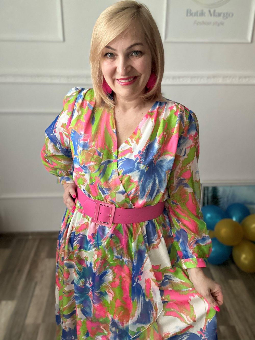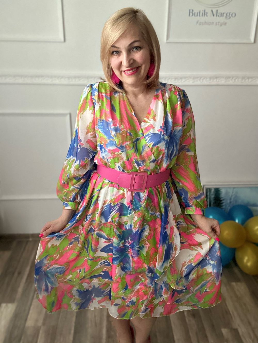 Szyfonowa sukienka POLA, bardzo elegancka sukienka multikolor z dodatkiem neonowej zieleni, różu, granatu i bieli, średnio krótka sukienka w kształcie litery A. W zestawie jest eko skórkowy pasek do zapinania w kolorze różowym. Sukienka posiada w pasie ściągacz gumkowy, ma długie rękawy zapinane na guzik koloru złotego, dekolt zakładany. Długość sukienki jest lekko za kolano. Boki ma delikatnie dłuższe. Sukienka jest lekka i zwiewna, zawiera elastyczną, dopasowującą się podszewkę. Fason sukienki sprawia, że jest bardzo kobieca i zmysłowa. Dzięki lekko rozkloszowanemu dołowi nadaje sylwetce lekkości i zwiewności. Ta elegancka sukienka w zachwycającej kolorystyce jest doskonałą propozycją na każdą uroczystość rodzinną oraz firmową.