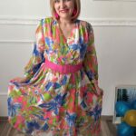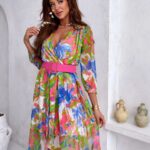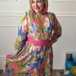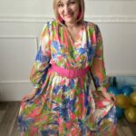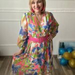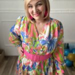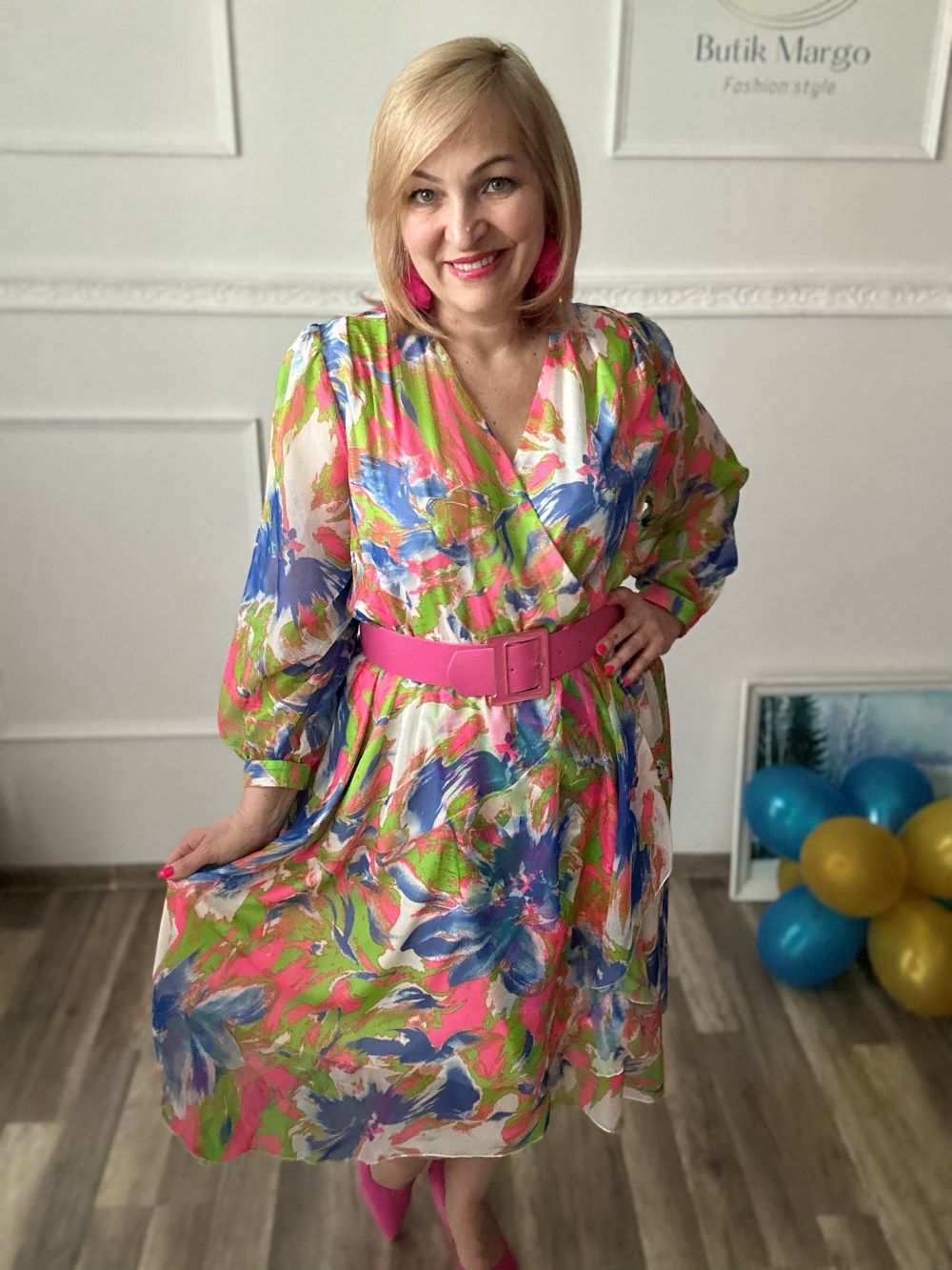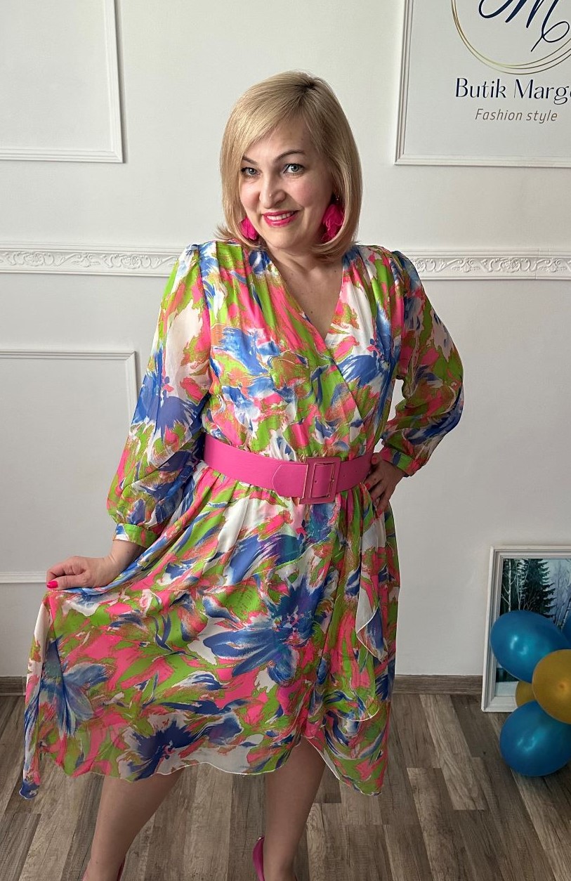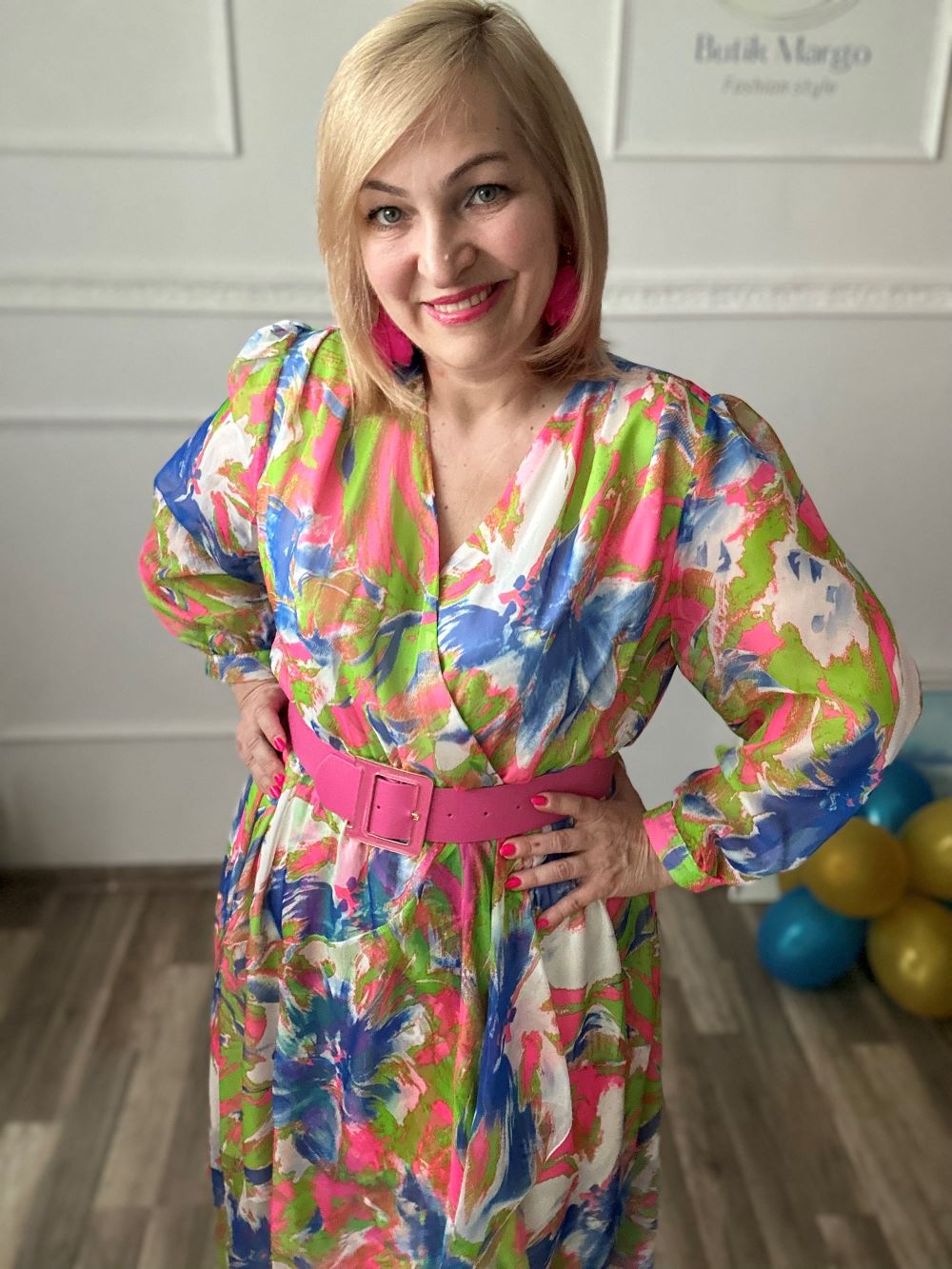 Szyfonowa sukienka POLA, bardzo elegancka sukienka multikolor z dodatkiem neonowej zieleni, różu, granatu i bieli, średnio krótka sukienka w kształcie litery A. W zestawie jest eko skórkowy pasek do zapinania w kolorze różowym. Sukienka posiada w pasie ściągacz gumkowy, ma długie rękawy zapinane na guzik koloru złotego, dekolt zakładany. Długość sukienki jest lekko za kolano. Boki ma delikatnie dłuższe. Sukienka jest lekka i zwiewna, zawiera elastyczną, dopasowującą się podszewkę. Fason sukienki sprawia, że jest bardzo kobieca i zmysłowa. Dzięki lekko rozkloszowanemu dołowi nadaje sylwetce lekkości i zwiewności. Ta elegancka sukienka w zachwycającej kolorystyce jest doskonałą propozycją na każdą uroczystość rodzinną oraz firmową.
