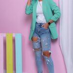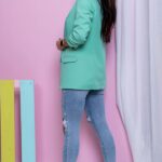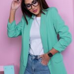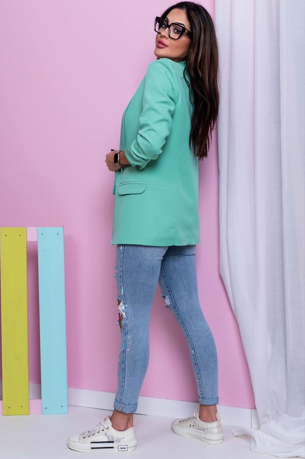 Żakiet MELO, kolor mięta, klasyczny, elegancki, niezapinana marynarka, krój prosty, posiada lekko marszczone rękawy, kołnierzyk oraz patki imitujące kieszenie. Uszyty jest z nieelastycznego materiału. Zawiera podszewkę w kolorze żakietu. Dodatkowym atutem są umieszczone poduszki na ramionach. Bardzo wygodna marynarka. Idealna do wielu stylizacji. Świetna do jeansów i eleganckich spodni oraz spódnic.