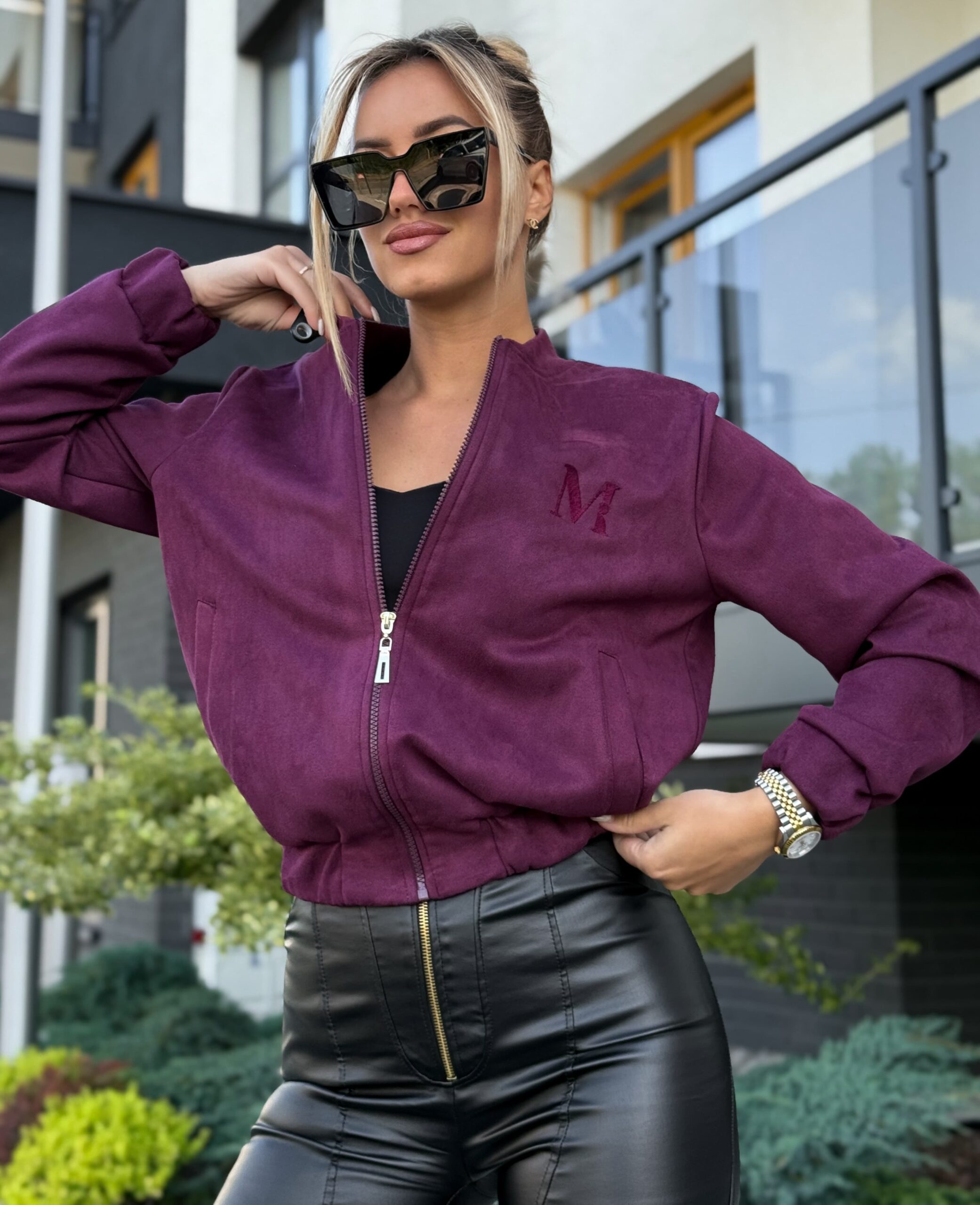 Krótka zamszowa bomberka wykonana z miękkiego, elastycznego materiału zapewnia wygodę i stylowy wygląd. Zapinana na zamek, posiada boczne kieszenie oraz ściągacze z gumą przy rękawach i dole. Całość uzupełnia haft w kształcie litery M.