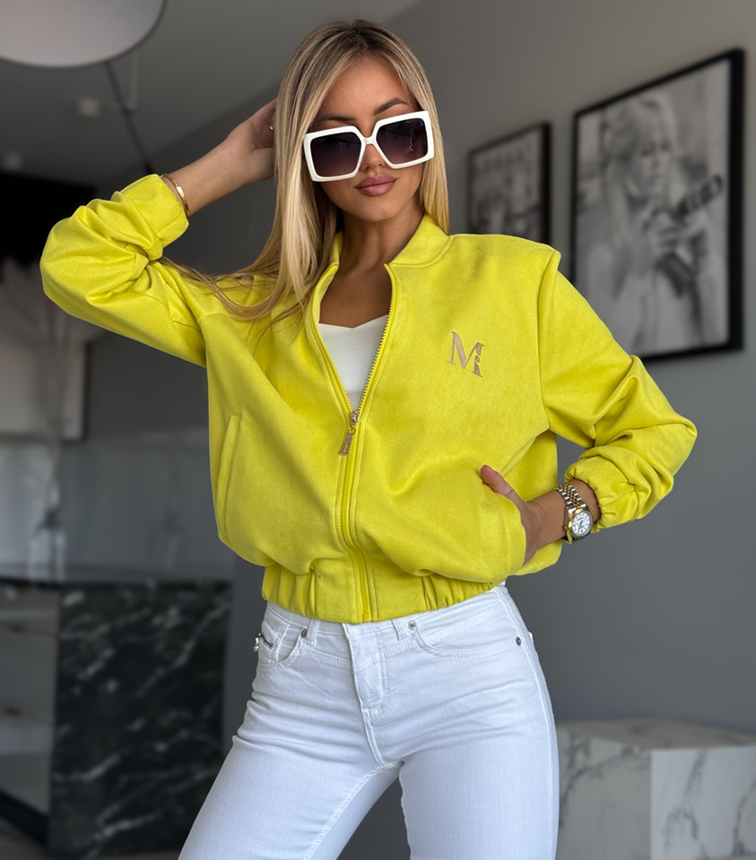 Krótka zamszowa bomberka wykonana z miękkiego, elastycznego materiału zapewnia wygodę i stylowy wygląd. Zapinana na zamek, posiada boczne kieszenie oraz ściągacze z gumą przy rękawach i dole. Całość uzupełnia haft w kształcie litery M.